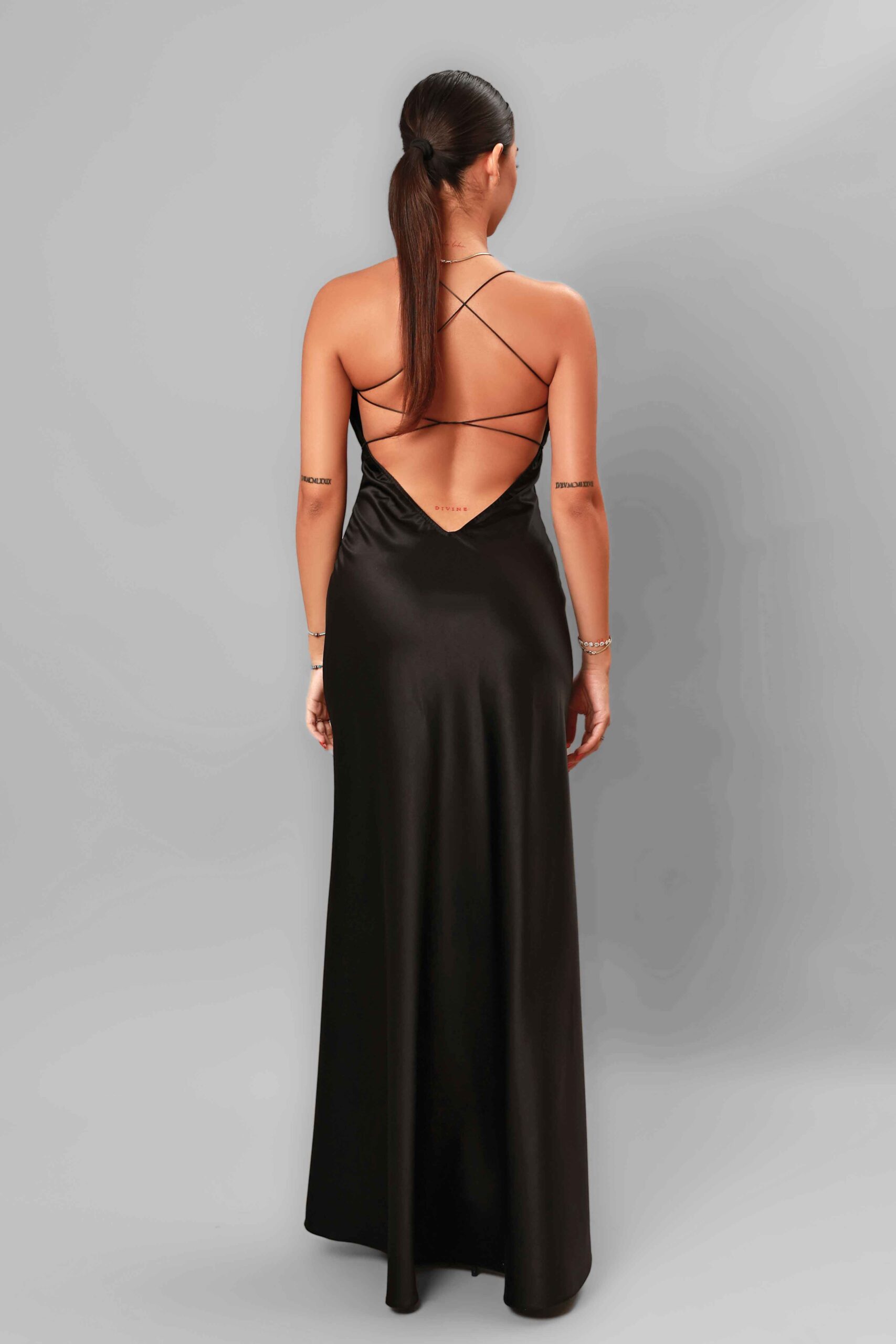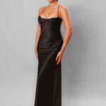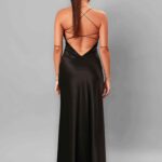 Rochie lungă cu bretele, executată din tafta elastică, de culoare neagră.